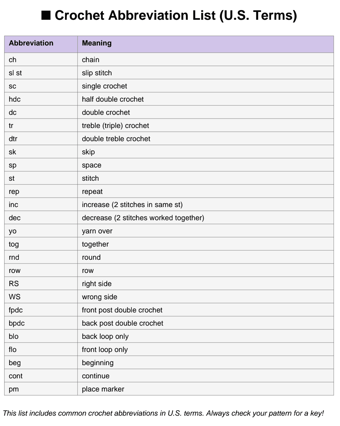 Abbreviations are mostly common but It’s important to note which US/UK terminology the pattern follows. The abbreviations vary. A list of some common abbreviations is given below.